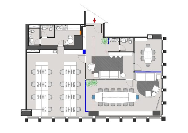 A partir da unificação de duas unidades, conseguimos explorar bastante os estudos de layout iniciais, até chegarmos na melhor forma de ocupação para abrigar o programa de necessidades dos clientes que consistia em uma sala operacional para cerca de dez/doze estações de trabalho; duas salas de reuniões: uma sala maior, para quatorze pessoas, e outra menor, para seis pessoas; um espaço que funcionasse como recepção/lounge/descompressão, tudo num mesmo ambiente, amplo e, de preferência, com vista; além de banheiros e copa.